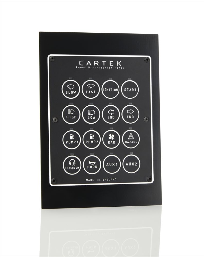 The CARTEK Power Distribution Panel Retro Edition is a fully integrated, fully electronic solution to power distribution in race and rally cars. Designed to replace 16 Fuses, Relays and Switches as well as a variety of control systems, these units therefore greatly simplify the wiring, reducing build time, saving weight and maximising reliability.