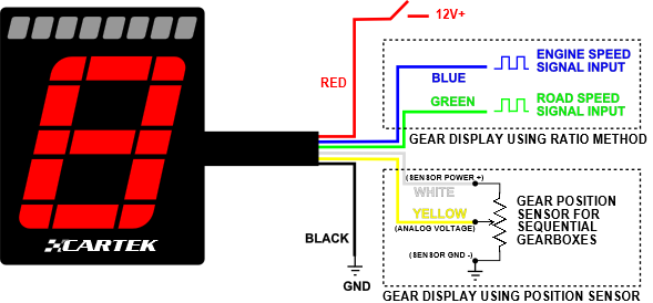 The GEAR INDICATOR from CARTEK is a dashboard mounted device that is designed to indicate to a driver the current selected transmission gear but also incorporates a sequential shift-light display which can indicate to a driver the optimum time to shift up a gear. The selected gear is indicated by a large, multi-coloured, 7 segment numerical display while the shift-light function is displayed at the upper part of the unit by 8 multi-coloured LEDs. These 8 LEDs form a display sequence that will commence at an engine speed prior to optimum and complete at precisely the optimum speed thereby giving the driver early indication to shift up before the rev limiter is reached or engine damage occurs. Not suitable for engines with older CDI Ignition systems.