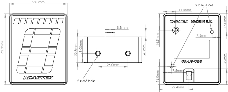 The Gear Indicator unit should be mounted securely on the dashboard where the display can be clearly seen by the driver. Mounting can be by two M3 screws from the underside or two M3 screws from the rear of the unit.